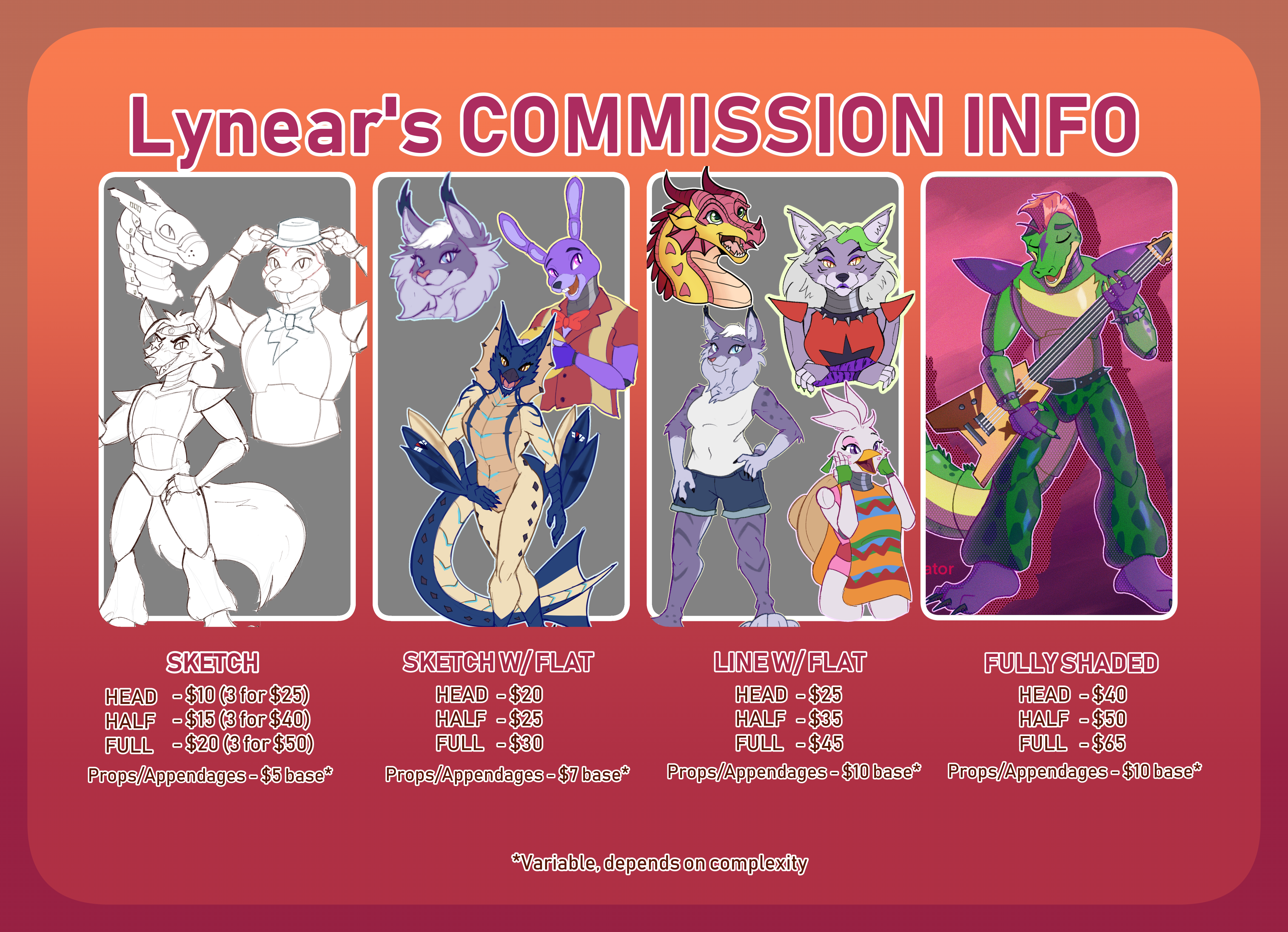Make a pricing table of your commisisons, and make sure that it is clear and easy to understand. I made something like this in order to advertise the different tiers in my commissions. I also made a pricing table in a separate document that lists the terms and conditions.